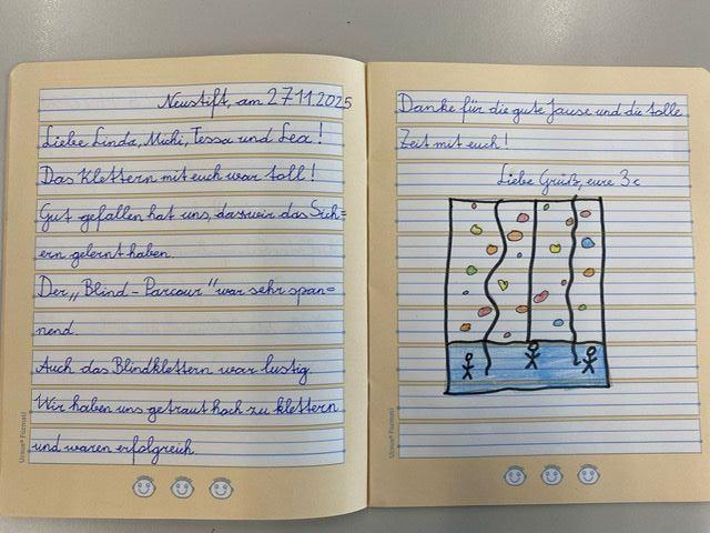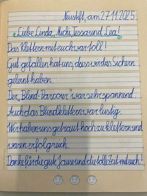 Am Mittwoch, den 26.11.25 verbrachte die 3c einen sportlichen Vormittag hoch oben auf der Kletterwand! Dank der hervorragenden Kletterlehrerinnen Lea, Linda, Michi und Tessa (Österreichischer Alpenverein) wurden es spannende, lehrreiche und lustige Stunden!
